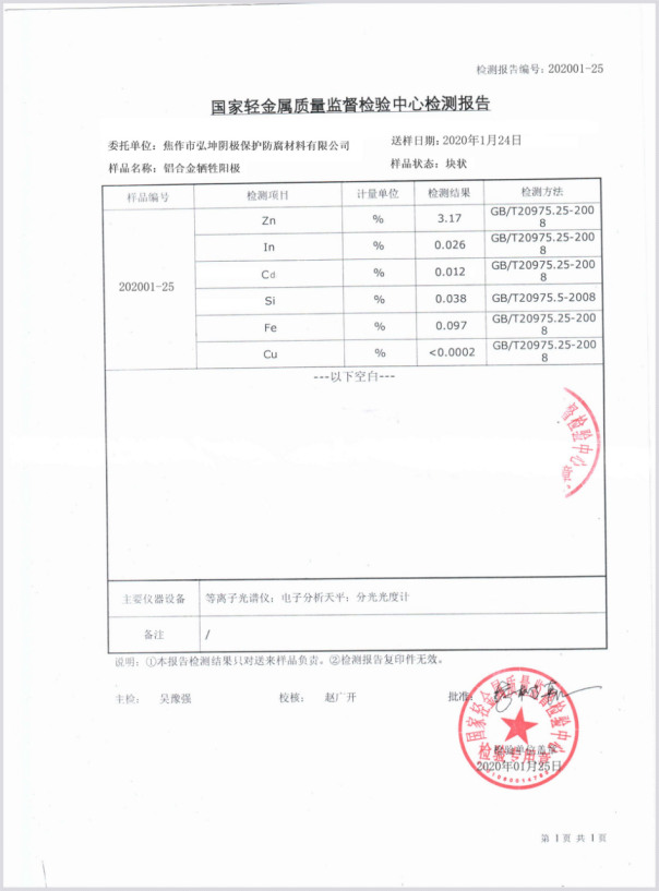 鋁合金犧牲陽極檢驗報告II