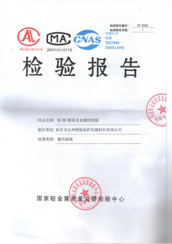 鋁-鋅-銦系合金犧牲陽極檢驗報告Ⅰ